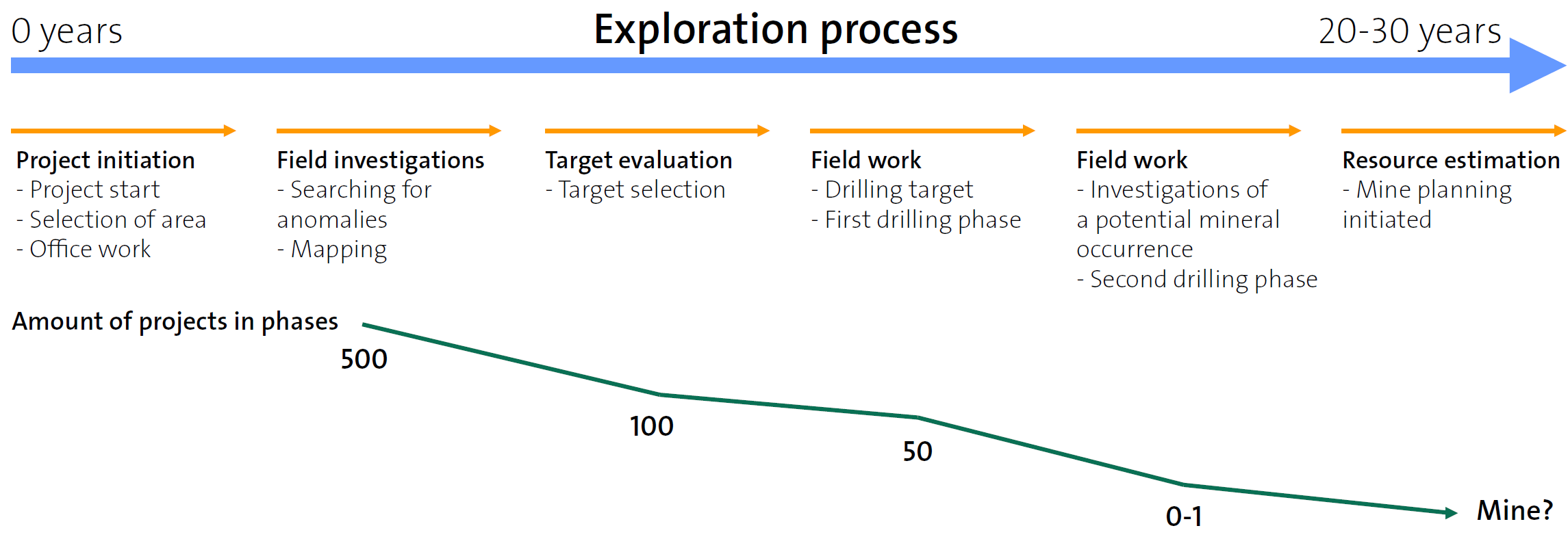 Out of 1,000 prospecting projects, only about one gives sufficient indications of the existence of ore in the area. The entire process from the initial field mapping stage to the start of mine planning usually takes several decades, even if there are favourable geological indications of ore in the area. Most prospecting projects fail to find ore.